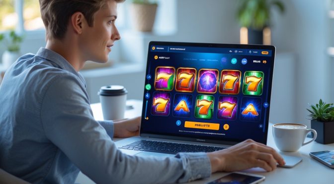Seorang dewasa muda duduk di meja kerja modern dengan laptop yang menampilkan permainan slot online yang sedang berjalan.