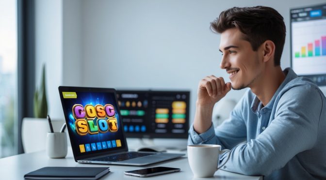 Seorang dewasa muda duduk di meja dengan laptop menampilkan permainan slot online, terlihat fokus dan tersenyum di ruang kerja yang terang.