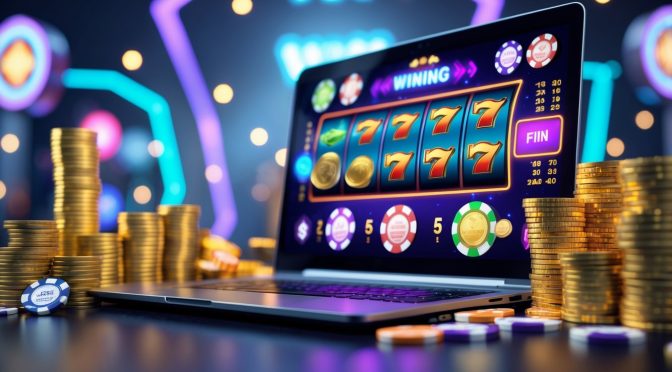 Sebuah meja dengan komputer yang menampilkan permainan slot online dan tumpukan koin emas serta chip poker di sekitarnya.